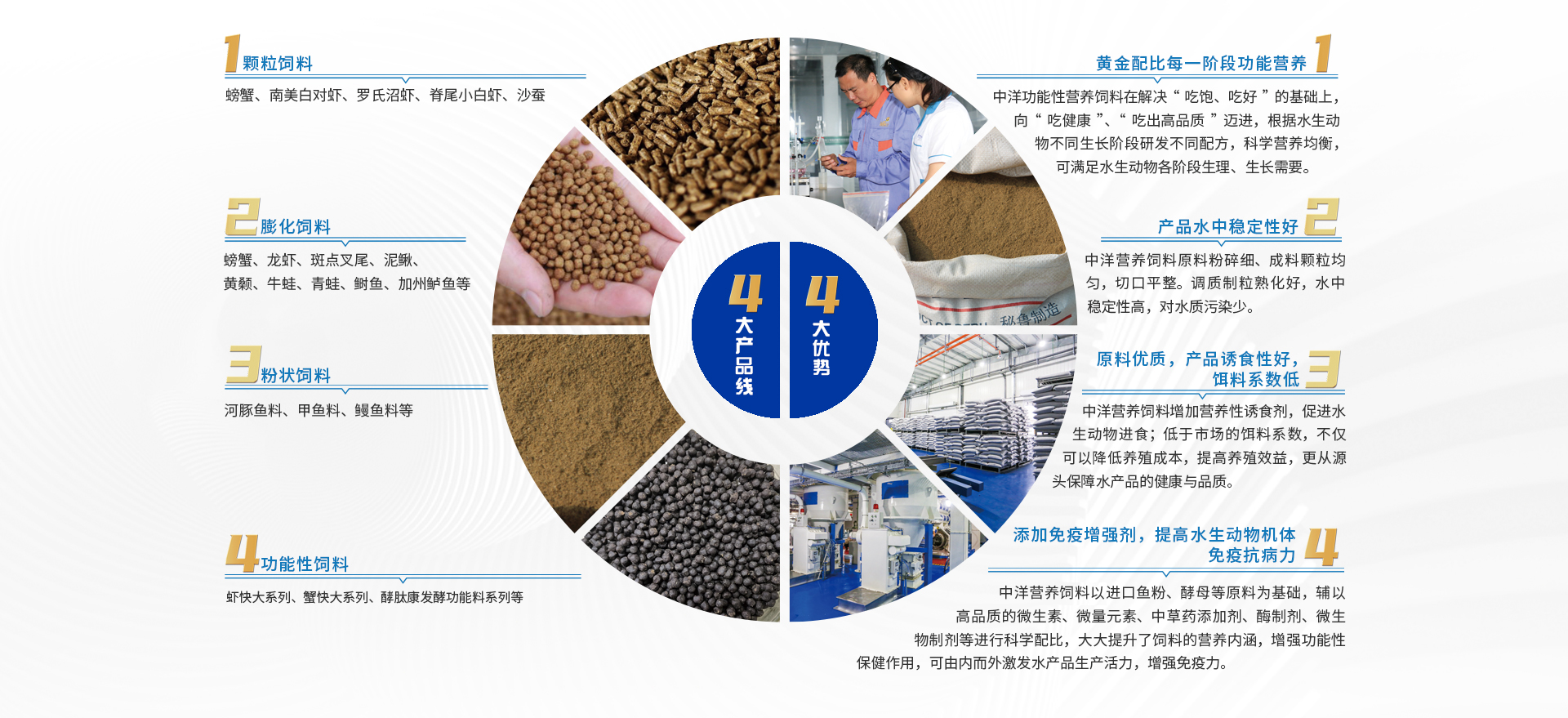 中洋營養飼料以產業衍生、科技支持,建有工程技術研究中心,企業院士、博士后工作站和多個開放式科研平臺,擁有專家團隊和技術骨干,與國內水生動物營養和飼料研究領域杰出科學家、科研院所合作,開發生態高效功能性營養飼料,并根據水生動物不同生長階段研發不同配方——由公司牽頭合作研發的河豚魚飼料(發明專利號ZL02138607.2),產品技術填補多項國內空白