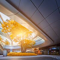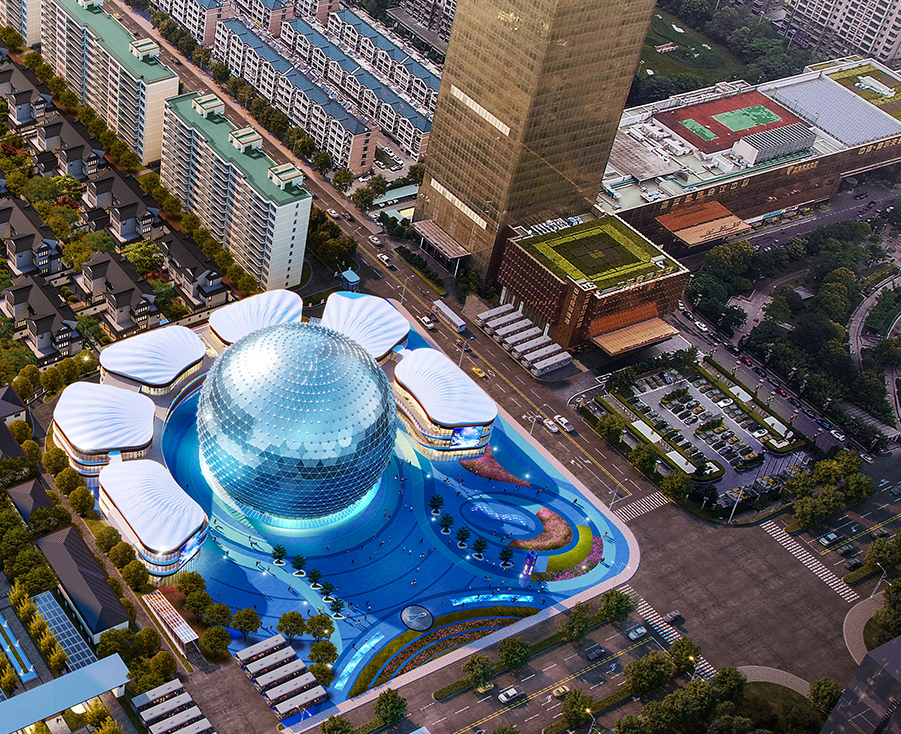 占地面積18000平方米,建筑面積15000平方米,標志性建筑為高42米,直徑50米的銀色圓形建筑和6座環抱半壁的白色扇貝形建筑。與金磚酒店南北比肩,方圓相應、金銀相間,天圓地方。